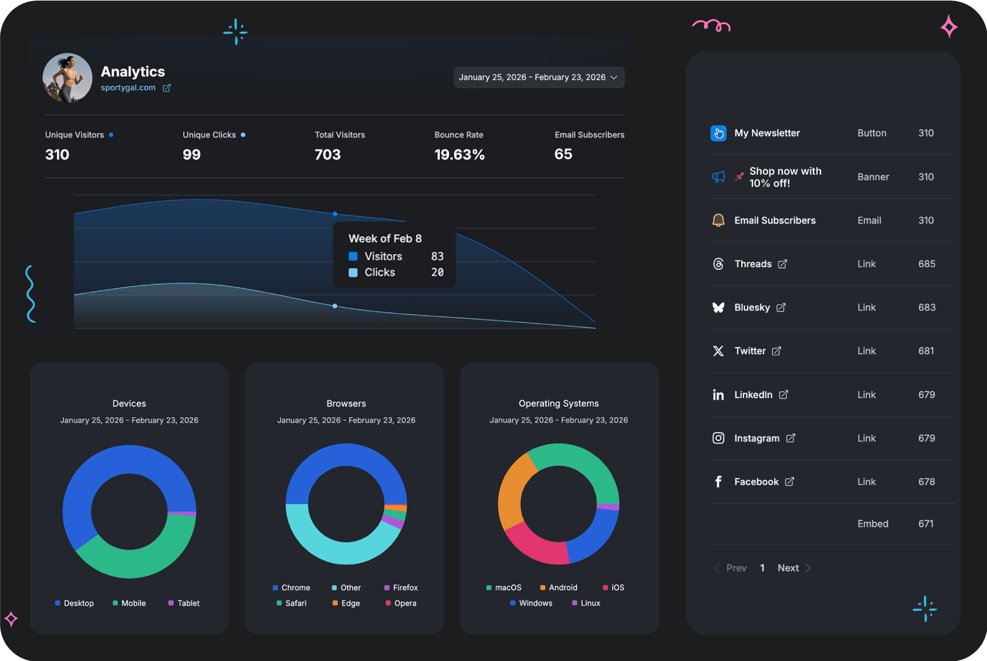 You can track unique visitors, total visitors, unique clicks, total clicks, bounce rate, traffic sources, countries, devices, browsers, operating systems, and performance over time.