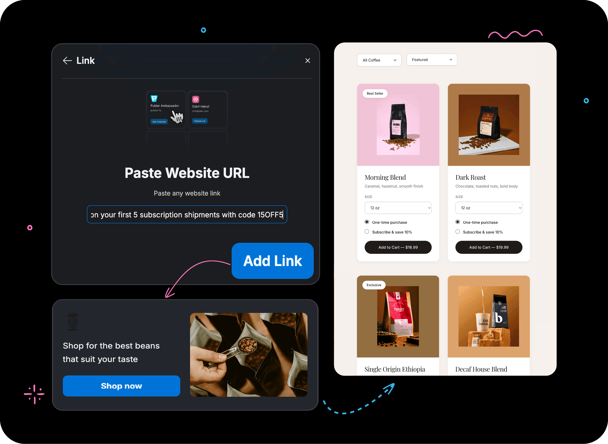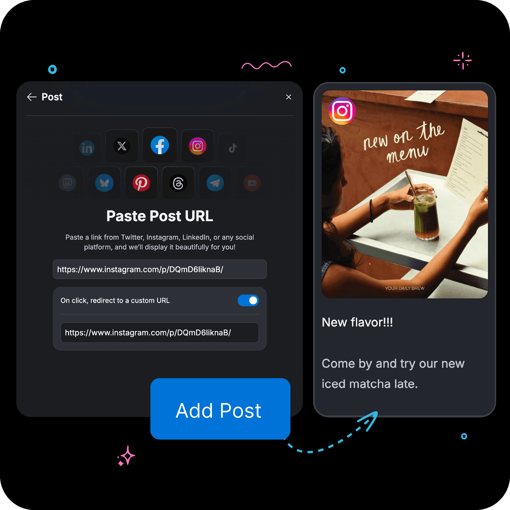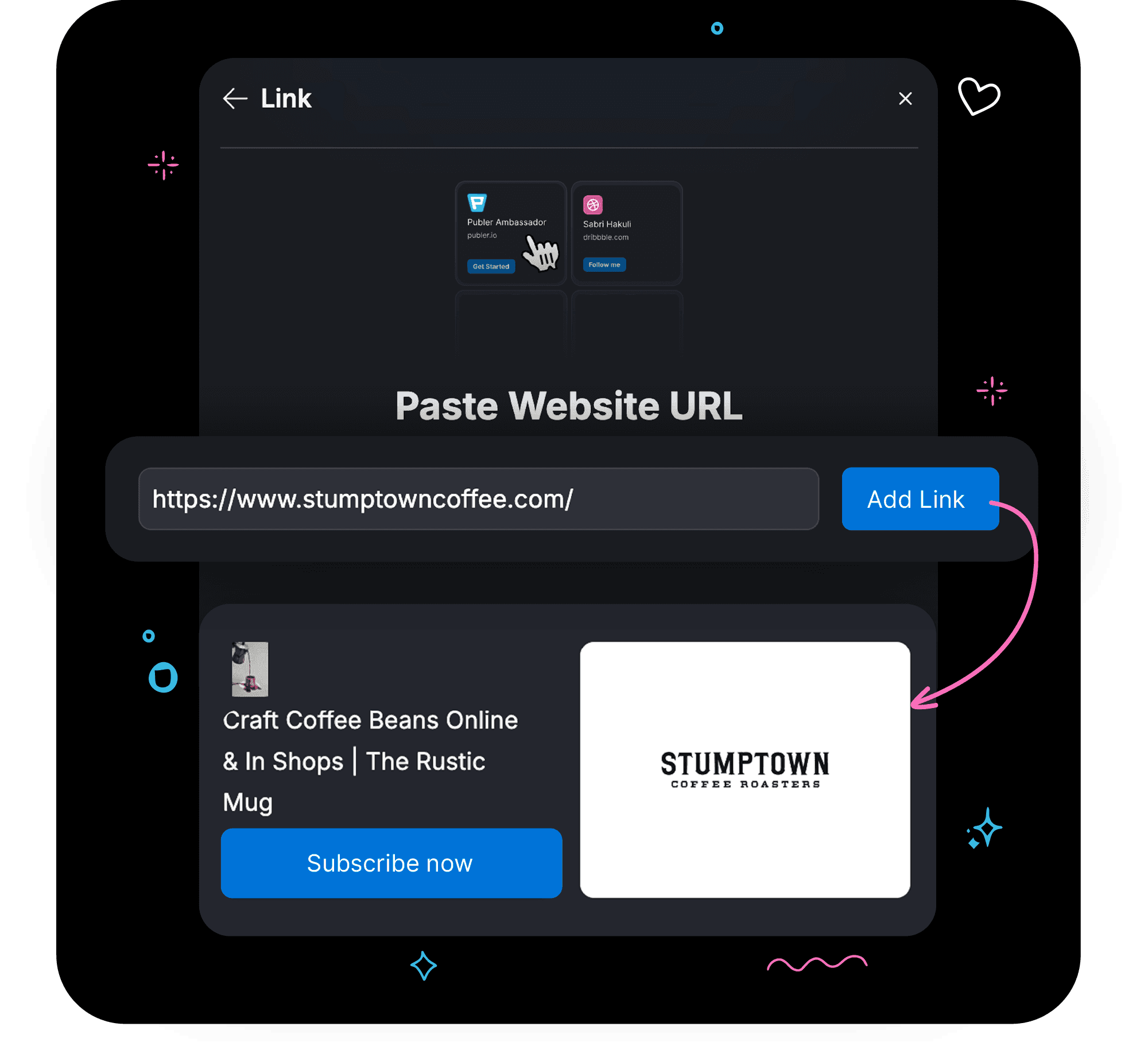 You can add website links, social media posts, profile links, and embedded content such as videos, music, or maps. Each card can be customized with images, text, and calls to action.