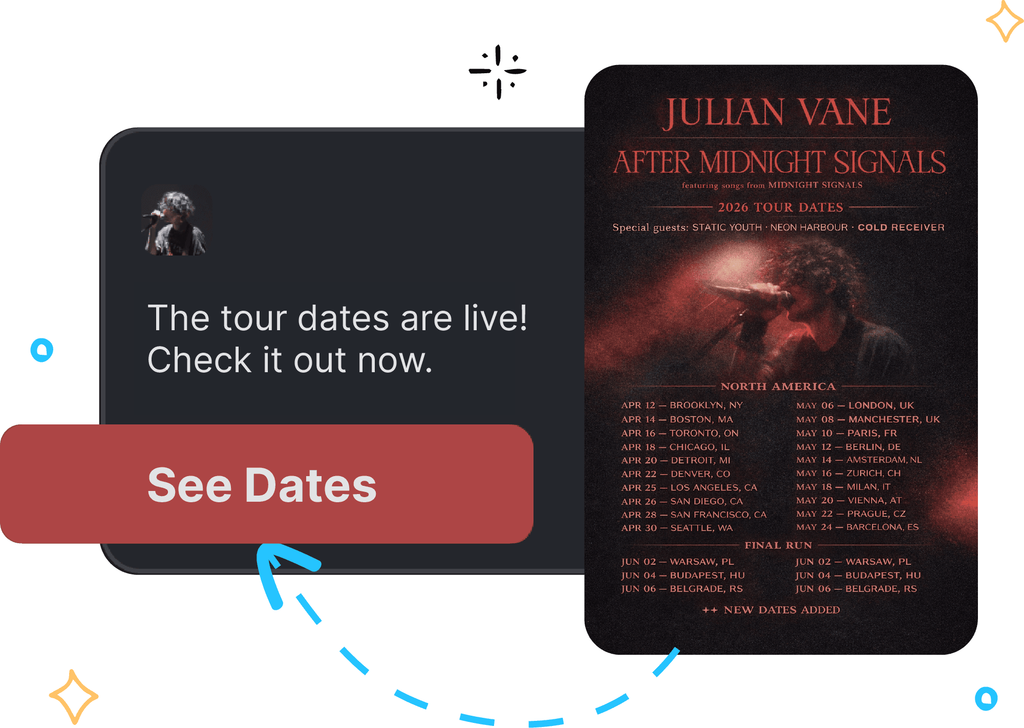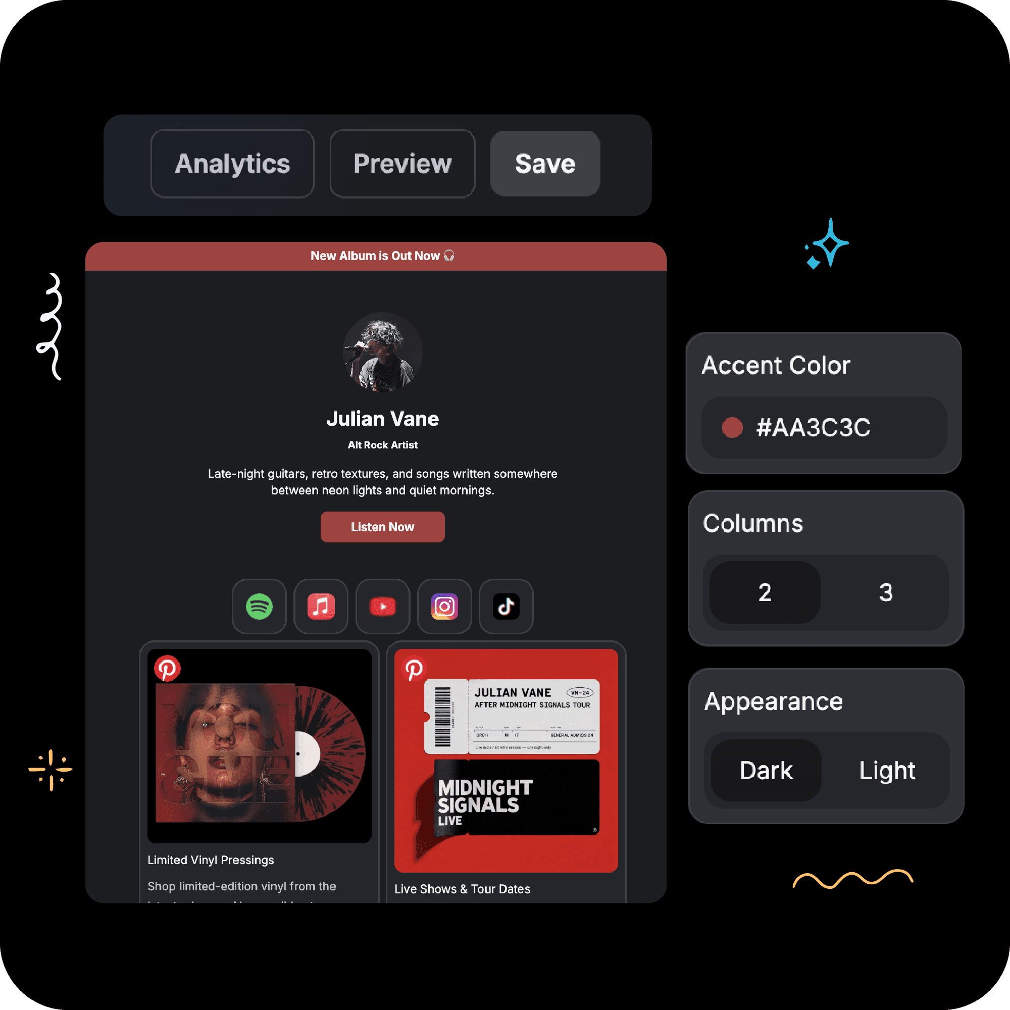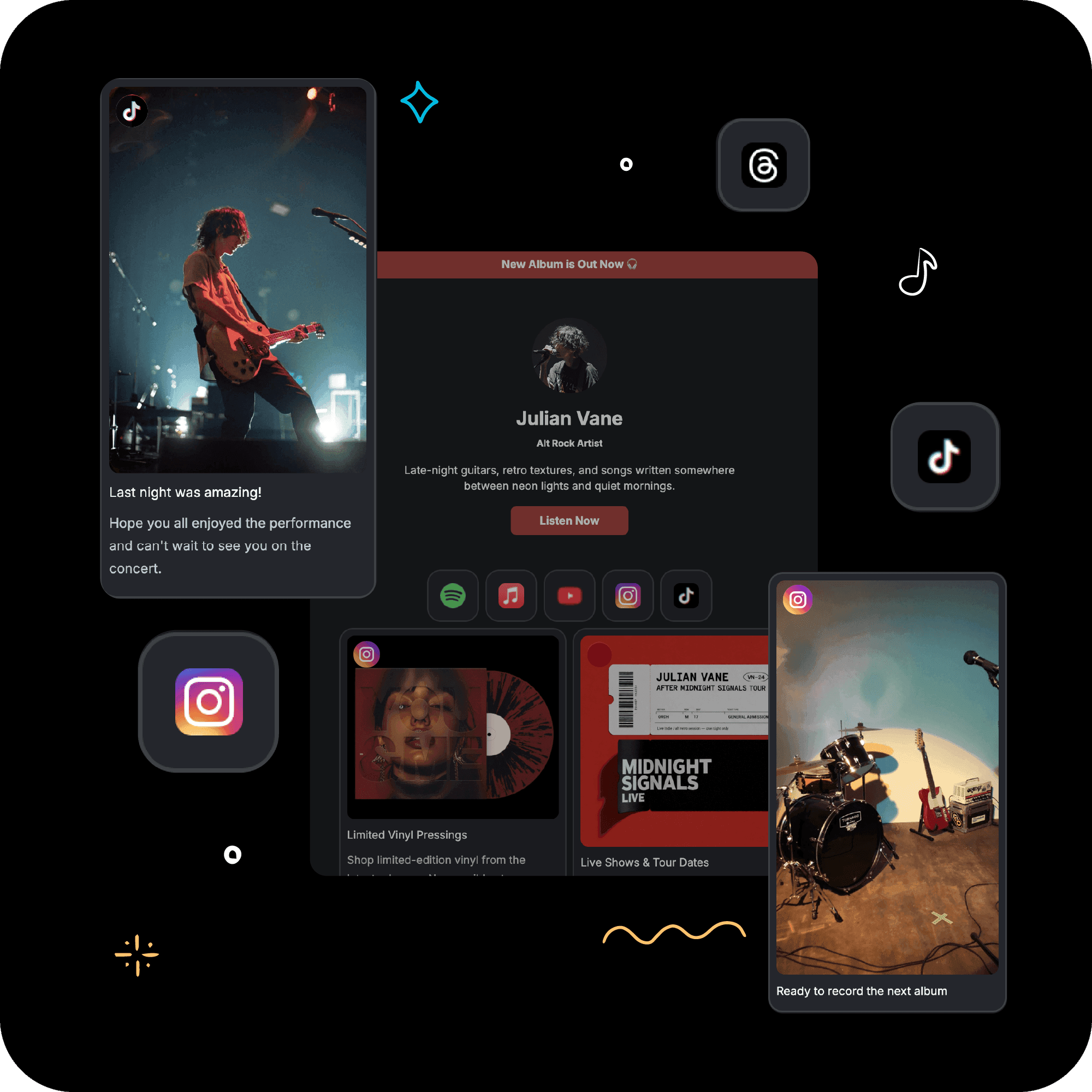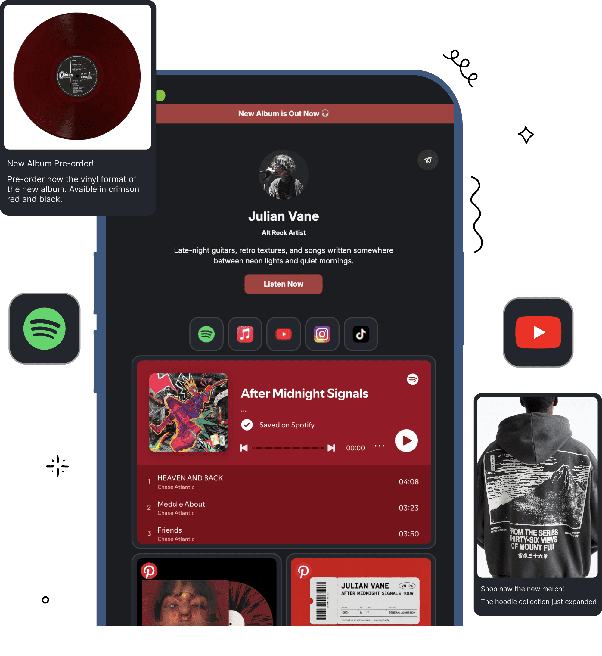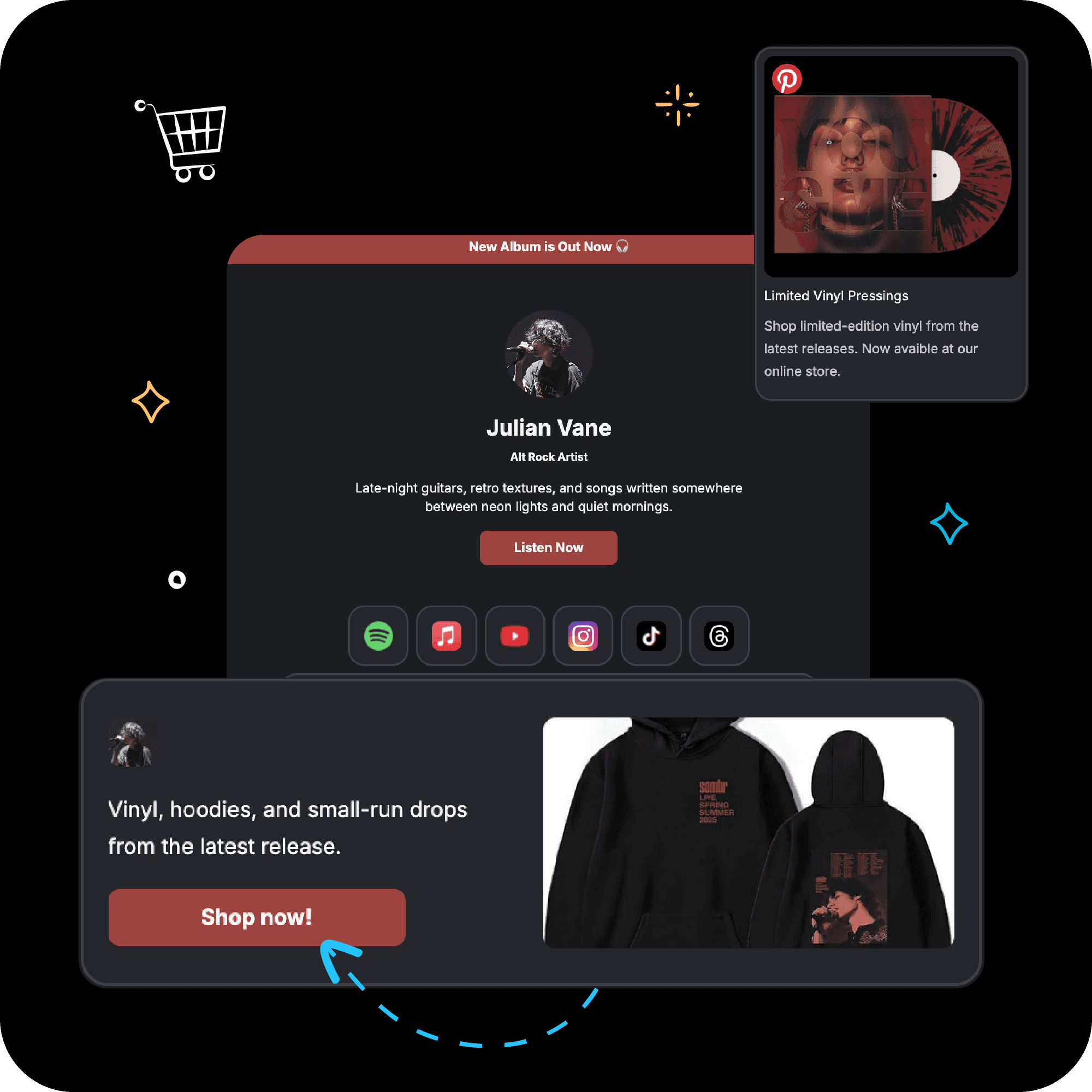 You can create custom link cards to sell merch, vinyl, or digital products. Add images, descriptions, and direct links to your store so fans can buy while they’re already engaged with your content.