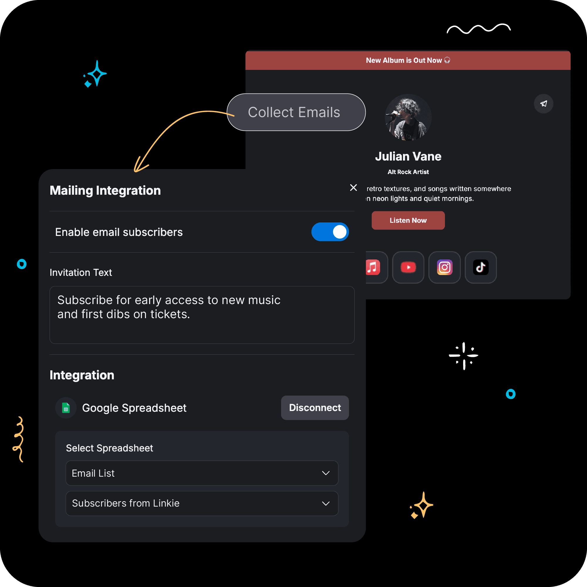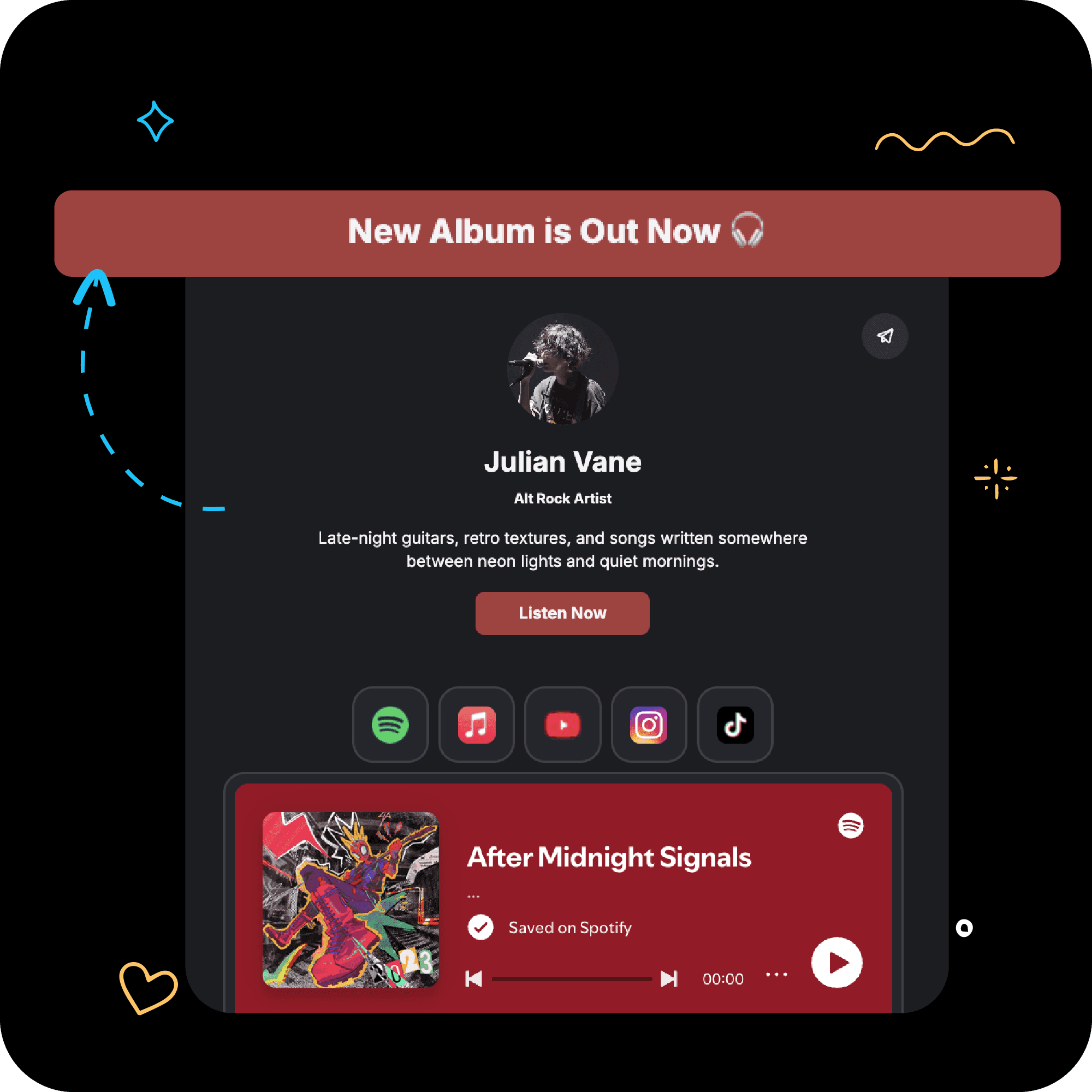 Yes. You can embed Spotify playlists and YouTube videos directly into your Linkie so fans can press play instantly without leaving your page, helping increase streams and engagement.