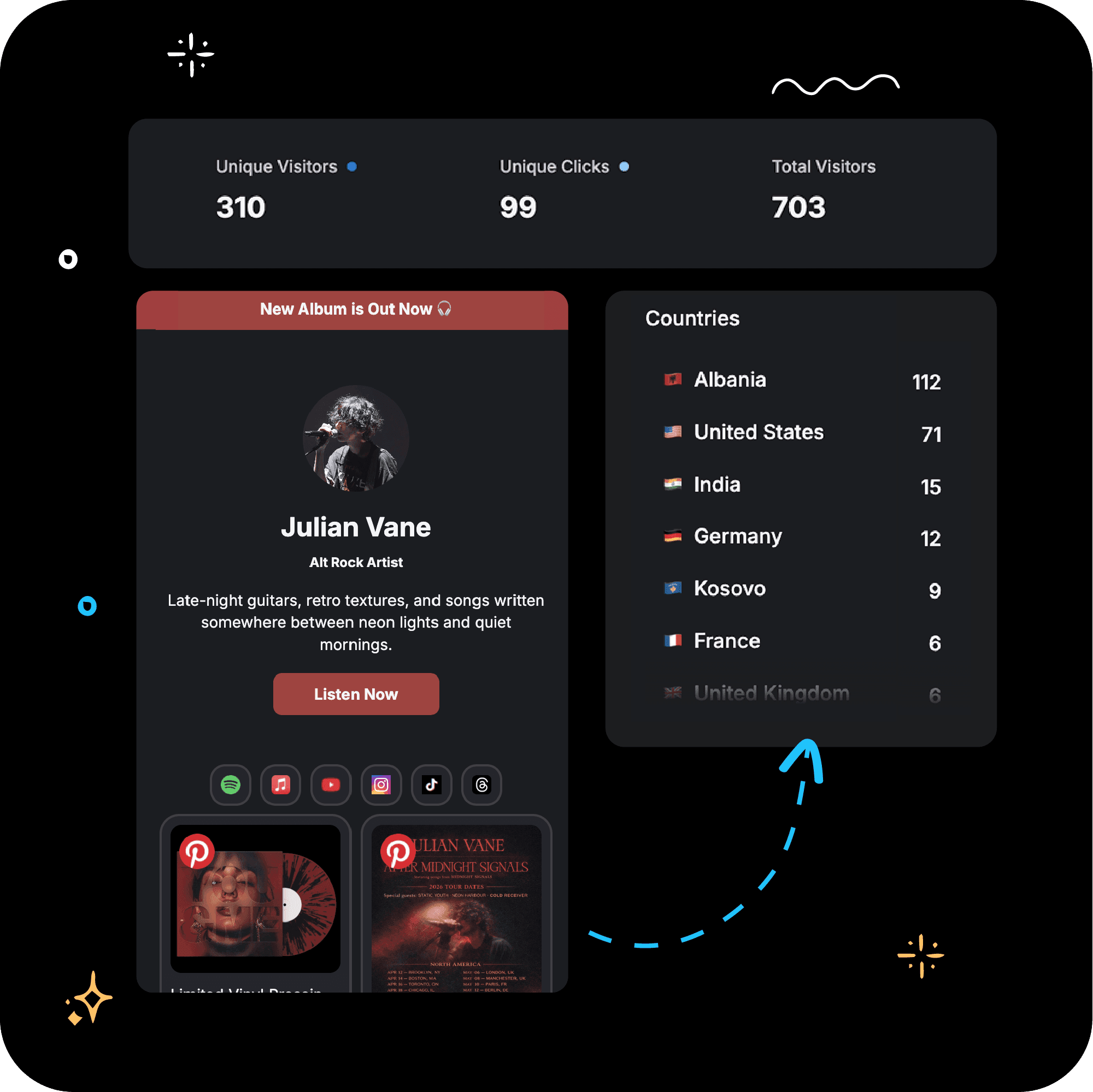Yes. You can track clicks, visitors, and audience insights like location and behavior. This helps you understand what your fans engage with and plan better releases, tours, and campaigns.